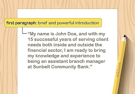 Introduce yourself quickly but powerfully in the first paragraph. It is essential that you let readers know who you are, what position you seek, and why you’d be a good fit for the position in the first few lines of your letter. Conclude this introduction paragraph with a unique reason why you’d be perfect for the job. Aim for at most 2-3 sentences for your introduction. Sticking to 35 total words, especially if you must stick with a one-page letter, will also leave ample space for the central paragraph(s). “Greetings. My name is Casey Weinberg, and I am applying for a job as an assistant branch manager” is brief but dull. Allow your introduction to introduce not only you, but the central components of your case for being hired: “Greetings. My name is Casey Weinberg, and with my 15 successful years of serving client needs both inside and outside the financial sector, I am ready to bring my knowledge and experience to being an assistant branch manager at Sunbelt Community Bank.” If you have any contacts or character references within the company, mention these in your introductory paragraph as well.