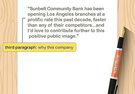 Explain why you want to work for this company in the third paragraph. Don’t just copy a description of the company from its website or from the job posting. Instead, describe in creative detail why you want to work for this particular company instead of another one. As well, describe why this is the type of banking job you want as opposed to some other type of job. For example, if this particular banking company is known for producing some of the most successful people in the financial industry, say that you want to work for what is evidently one of the best financial institutions in the business. A slight hint of flattery and a lot of research will go a long way in this paragraph. Don’t be afraid to wear your heart on your sleeve when it comes to explaining why you’re seeking a job with this particular company.