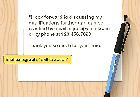 Conclude with a “call to action” that invites the reader to contact you. First, reiterate why you’re the ideal candidate for the position. Then, simply end this paragraph with a sentence stating that you would be happy to discuss your candidacy further in an interview and that you look forward to hearing from them. Make sure you include your contact information in this paragraph if it isn’t included at the top of your letter. If possible, include multiple different means of getting in touch with you. Thank the reader for their time and consideration before concluding the cover letter with “Sincerely, Casey Weinberg.”