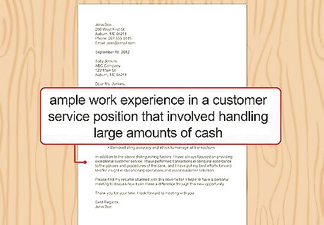 Determine what skills or experiences make you a fit for this job. As the person in charge of reading through applications scans over your cover letter, they need to see an immediate, clear explanation of why you are the right one for the job. Therefore, you need to figure out the answer to this question for yourself so that you’ll be able to articulate it in your cover letter. Your letter essentially has to answer several key questions, including: “Who am I?”, “Why do I want this (specific) job?”, “Why should you want me for this (specific) job?”, and “What do I have (attributes, skills, experiences, etc.) that you need?” For example, when applying for a banking job, some skills that would make you a particularly strong candidate include communication skills, problem-solving abilities, and cash handling skills. If you want to get a job as a bank teller, it can be really helpful to garner some experience in a position that involves customer service and cash handling, such as a salesperson or cashier. The goal in the application process and as a job seeker, is to differentiate yourself versus your competition. So, talk about your benefits and explain how that employer can benefit from the skills and the expertise that you bring.