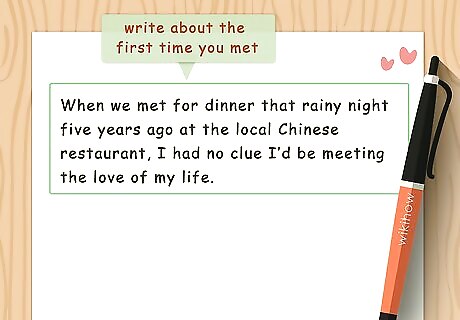 Write about the first time you met your partner. Maybe you had a first meeting where you ran into each other randomly in a public place. Or perhaps you met on a first date that went incredibly well. Think about the emotions and feelings you felt for your partner when you first met them. Try to describe the setting of the first time you met your partner. For example, you may write down, “When we met for dinner that rainy night five years ago at the local Chinese restaurant, I had no clue I’d be meeting the love of my life.”
