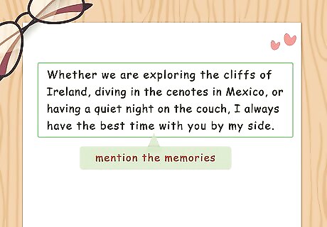 Make a list of great memories you have with your partner. You can also jot down a list of the great memories you have shared with your partner during your marriage, and courtship. You can then pull from the list and use the memories throughout your letter. Treat the memories like snapshots, where you list them in order to chart the progression of your relationship. For example, you may write, “Whether we are exploring the cliffs of Ireland, diving in the cenotes in Mexico, or having a quiet night on the couch, I always have the best time with you by my side.”