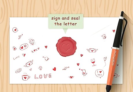 Sign and seal the letter. Once you are satisfied with the letter, sign your name at the bottom. Then, fold up the letter and place it in an envelope. Write your partner’s name on the envelope and seal it so you can give it to them. Personalize the envelope by drawing a doodle of your partner, or of a special symbol you both like. You can also make you own envelope to put the letter in.