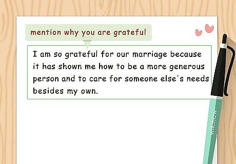 Reveal why you are grateful for your marriage. Think about how your marriage has enriched your life and made it better. List a few reasons why your are grateful that you married your partner and are committed to each other. For example, you may write, "I am so grateful for our marriage because it has shown me how to be a more generous person and to care for someone else's needs besides my own." Show appreciation for the things they do in your relationship that are really meaningful, too—even the little things. Details like that will make the letter feel really personal.