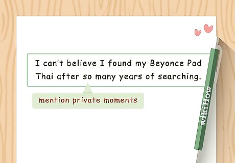 Include inside jokes and private moments. Make the letter personal and intimate for both you and your partner. If you and your partner have pet names, use them in the letter. If you have any inside jokes or funny asides you like to say to each other, include them. For example, you may write, “You’ll always be my Supergirl,” or “I can’t believe I found my Beyoncé Pad Thai after so many years of searching.”