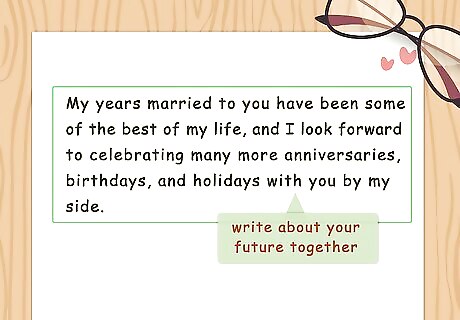 Write about your future together. Tell your partner how much you look forward experiencing life together in the future. Let your partner know you are excited about your future plans and to spending another wedding anniversary together as a couple. For example, you may write, “My years married to you have been some of the best of my life, and I look forward to celebrating many more anniversaries, birthdays, and holidays with you by my side.”