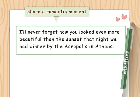 Think of a romantic moment you shared with your partner. You can also get inspiration flowing for the letter by remembering romantic moments that you shared with your partner during your marriage. Reminisce about a recent trip overseas you took together. Or think about a romantic picnic you shared with your partner. Describe the romantic moments so you can use them in your letter. You may write, “I’ll never forget how you looked even more beautiful than the sunset that night we had dinner by the Acropolis in Athens.”