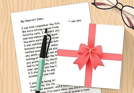 Include the letter with a gift. Enclose the love letter with an anniversary gift like chocolates, flowers, or a framed photo of you and your partner. If you are giving your partner an experiential gift, like a trip together, mention this in the love letter or as a post script at the bottom of the letter.
