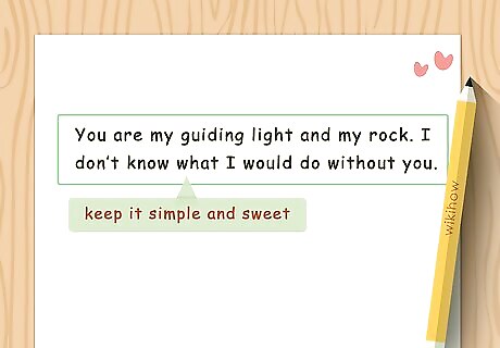 Keep the language simple and sweet. Avoid formal or stiff language in the letter. Use language that you might say to your partner during a casual conversation or an intimate talk. State how you feel about your partner using the first person, with language that they can understand. For example, you may write, “You are my guiding light and my rock. I don’t know what I would do without you,” or “I don’t think words can express how much you mean to me. I am so grateful you said ‘yes’ to me all those years ago.”