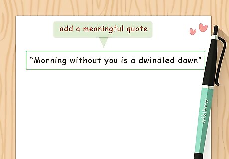 Add a meaningful quote. To add a personal touch to the end of the letter, you may include a quote from your partner's favorite writer or poet. You can also choose a quote from a book you both like. Or you may pick a quote from your partner’s favorite television show or movie. You can also use a quote from your wedding vows. You can find a list of romantic quotes from poems online.