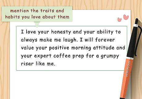 Discuss the traits and habits that you love about your partner. You may note your partner’s honesty, vulnerability, and sense of humor. Or you may discuss habits like “holding the door open for me,” “making coffee for us in the morning,” or “caring for me when I’m sick.” For example, you may write, “I love your honesty and your ability to always make me laugh. I will forever value your positive morning attitude and your expert coffee prep for a grumpy riser like me.”