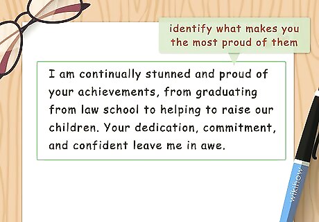 Identify what makes you the most proud of your partner. You can express how proud you are of your partner's accomplishments in life. Recognize your partner as a person who is not afraid to achieve their own goals while balancing the commitments of a marriage. You can never go wrong by complimenting your partner—let them know what you think is really special about them. For example, you may write, "I am continually stunned and proud of your achievements, from graduating from law school to helping to raise our children. Your dedication, commitment, and confident leave me in awe."