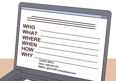 Include contact information. If your press release is successful, your recipients will want to follow up with you to get more information. Include all relevant information, including phone numbers, URL for the band’s Web site, and an e-mail address. Be sure to check your e-mail often and reply quickly. Similarly, if you include a phone number, check your voice mail and return calls promptly.