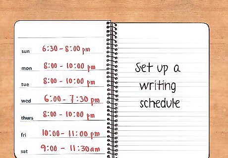 Set up a writing schedule. Writing a novel takes discipline and focus. You will be more likely to complete your masterpiece if you follow a writing schedule, where you write a certain number of words or pages a day. You may also choose a certain time of day to write and commit to writing during this time every day for weeks, months, or years, depending on how long it takes to finish the novel. For example, you may set up a schedule where you write 500 words a day in the morning at your desk before you go to work. Or you may create a writing schedule where you write 10 pages of your novel when you get home after work, before dinnertime.