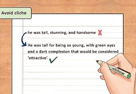 Avoid cliche. A novel riddled with cliche will likely not grab the attention of publishers or readers. As a writer, you should strive to create the most original descriptions and details you can come up with. Avoid cliches in your writing, which are phrases that have become so familiar they have lost their meaning. You should try to describe your characters in ways that are not cliche or familiar. For example, rather than use vague descriptions like “he was tall, stunning, and handsome”, be more detailed and specific. You may write, “He was tall for being so young, with green eyes and a dark complexion that would be considered ‘attractive’.” Use sensory details in your descriptions of settings and scenes, where you describe how something or someone smells, sounds, feels, tastes, and looks. For example, you may describe a room based on how it smells and how the furnishings feel against the hands of one of your characters.