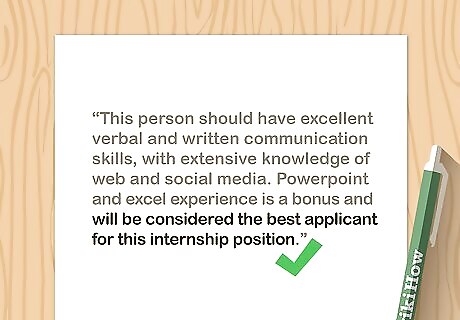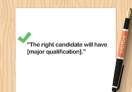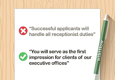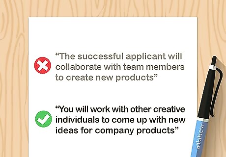 Write in the second person instead of the third person. Instead of using third-person pronouns like “they,” use the second-person pronoun “you” in order to better engage the reader. This will make potential applicants feel that they have a more direct relationship to you and your company, making them more likely to submit an application for the job. For example, instead of writing “The successful applicant will collaborate with team members to create new products,” write “You will work with other creative individuals to come up with new ideas for company products.”