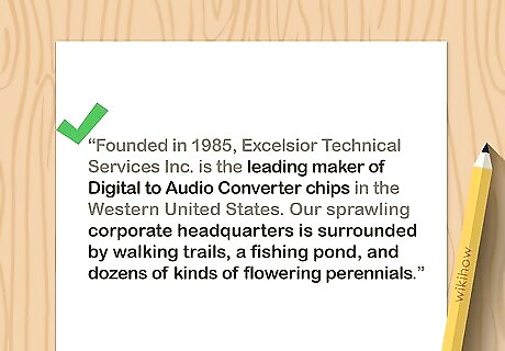 Tell the reader how the job will contribute to the company’s growth. Employees want to work for a company that is interesting and exciting in some way. Describe the company’s mission, what sets it apart from its competitors, and how they could further that mission in this job. To describe your company effectively, ponder the following questions: What does your company do? What makes it special and sets it apart from competitors? What is the goal of the company? Is it working toward social justice, striving to be at the top of its field, or aiming to provide an excellent service of some kind? Why do you enjoy working at your company? Try to think through your reasons for being a part of it as you write up your description.