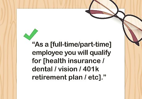 Give the reader a clear understanding of the job’s compensation. This will make potential applicants feel more confident that they know what their financial situation would be working for you. If the salary and benefits aren’t set in stone, provide an expected salary range and save any final determinations for the interview stage. Potential benefits to include may include paid vacation days, health insurance, pension plans, or housing benefits.