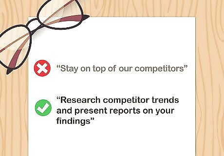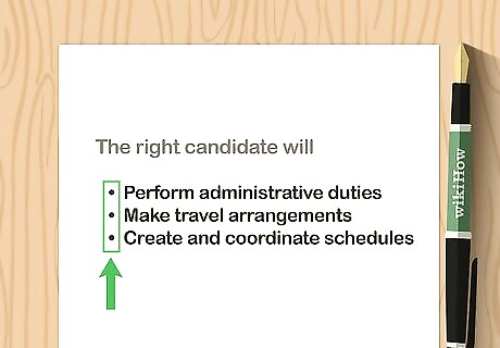 List the job’s duties and responsibilities in bullets below the summary. List between 5 and 10 key responsibilities, erring on the side of being concise. The responsibilities should be clear and have an obvious purpose. Include information on how often certain responsibilities will be performed and what percentage of the entire job they encompass. For example, write "Research competitor trends and present reports on your findings," rather than "Stay on top of our competitors." Using bullet points instead of full paragraphs of text will make it much easier for potential applicants to quickly read and understand the responsibilities of the job.