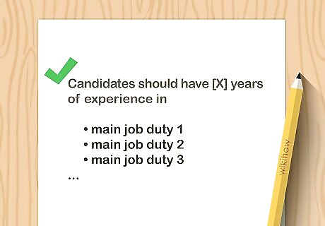 Add any required skills or qualifications applicants need to have. Be up front about exactly what skills, educational background, training, equipment proficiency, and other qualifications candidates need to have in order to actually do the job. Make sure your list is inclusive, or you may be in for some awkward conversations during the interview phase. The required qualifications should be those skills that are absolutely necessary for doing the job successfully. Don’t make your requirements too onerous, or else you may deter potentially great applicants from applying. Use bullet points to list these qualifications. The candidate should be able to skim through the list and immediately know whether they should apply.Tip: Include the ability to perform under the specific working conditions of the job in your required qualifications, if the working conditions are at all onerous.