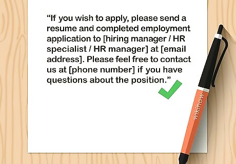 Conclude the job description with specific instructions on how to apply. Provide an email address or phone number for the applicant to contact if they want to apply.Include instructions for resume and cover letter formatting, if applicable. Be sure to include an application deadline at the end of your description. If you anticipate getting hundreds of cover letters and resumes, you may want to specify how you want the documents formatted so you'll have an easier time keeping track of everything. Listing a deadline may encourage applications to apply quickly, which could potentially help you find the right position for the job a lot faster.