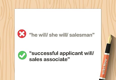 Use gender-neutral language to avoid being discriminatory. Biased or gendered language can deter good applicants from applying for your job if it makes them feel like they wouldn’t be a good fit. Avoid using words that are masculine, feminine, or otherwise coded in a way that may make potential applicants feel unwanted. For example, instead of starting a sentence with “He will” or “She will,” write “The successful applicant will.” Refrain from using any words that end in “man,” such as “salesman.” Use a gender-neutral synonym like “sales associate” instead.