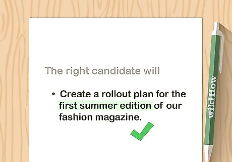 Create a sense of urgency to encourage readers to apply. You’ll want candidates to feel compelled to apply for your position, even if they’re already employed elsewhere. Post a specific start date for the job, as well as any immediate goals that the successful applicant will be working towards in the position. For example, add a bullet point to the responsibilities section that reads “Create a rollout plan for the first summer edition of our fashion magazine.”Tip: If possible, listing the contact information for a specific individual, rather than the company’s generic email address, will also help to create a sense of urgency for the position.
