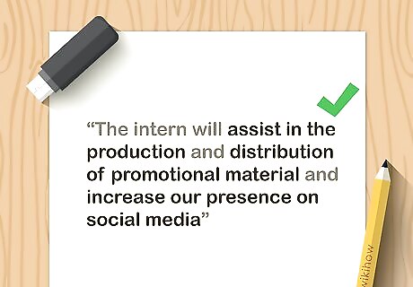 Maintain a positive tone to make readers optimistic about working for you. Avoid sounding too demanding or focused on the minute details of the job. Instead, use an upbeat tone and optimistic language that will convince potential applicants that it would be fun to work for your company. At the same time, avoid using a lot of superlative language like “best of the best” or “greatest employees.” This will sound over-the-top and may discourage people from applying.Tip: Proofread the job description and make sure the writing is grammatically correct. Job applicants won't look well upon your company if the job description isn't well written.