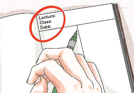Provide a heading. As with all note taking, your notes should be organized chronologically and topically by placing a heading at the top of the outline for each page. Staying organized will save you time and effort. Place the title of the lecture, the class, and date at the top of the page for easy reference. If you must take multiple pages of notes, make sure to add page numbers.