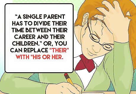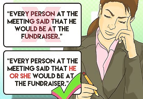 Include both male and female pronouns when referring to people in general. Instead of using “he” or “him” to represent a group, include “he or she” and “him or her.” Using only the male pronoun to refer to both men and women is bias. For example, it is bias to say something like, “Every person at the meeting said that he would be at the fundraiser.” Instead, include both gender pronouns. “Every person at the meeting said that he or she would be at the fundraiser.” Some people are beginning to use they or their instead of gender pronouns.For example, "The shopkeeper paid their bills on time."