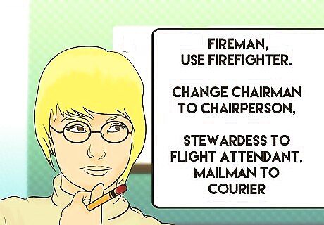 Change gender-specific professional titles to gender-neutral. Gender neutrality is key to writing free of bias when you are talking about both sexes. When referring to a group of law enforcement officers, it is not fair to assume that they are all male. The same goes for any profession. Instead of saying fireman, use firefighter. Change chairman to chairperson, stewardess to flight attendant, mailman to courier, and actress to actor when referencing a profession in general and not writing about a specific professional. Using gender neutral titles is not only politically correct, it is also a way to be inclusive.