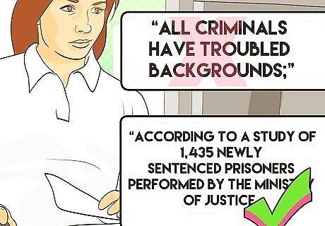 Stay away from making generalizing statements. Do not make a statement within your writing that ropes everyone together by using the term “all.” Use specific numbers based on credible research to make informative claims. Present specific facts and numbers. It is bias to state something like, “All criminals have troubled backgrounds;” this is making a general and opinionated statement. Your writing will be a great deal more credible with facts that are researched instead of generalizations. Rephrase your statement to express free of bias facts, “According to a study of 1,435 newly sentenced prisoners performed by the Ministry of Justice, 49% reported having a troubled childhood.”