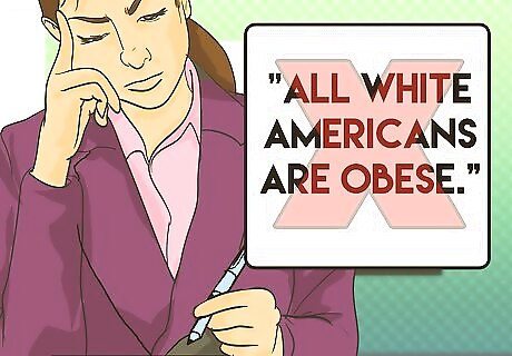 Avoid stereotypes. To make a statement about a particular group, there must be evidence and statistics to back up your objective statement. Some examples of non-factual statements include: "All white Americans are obese." "All African Americans are good at basketball." "Elderly citizens are helpless and need to be put in a home." "All Jews are good with money."