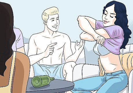 Play strip spin the bottle. In this saucy version of the traditional game, anyone the bottle lands on has to remove an article of clothing. The game continues until all players are stripped down to their undies (or totally nude). Be sure to only play this if you're an adult, and only with the consent of the whole group! To spice things up even more, consider adding a rule that if the bottle lands on the spinner, they must remove 2 articles of clothing.